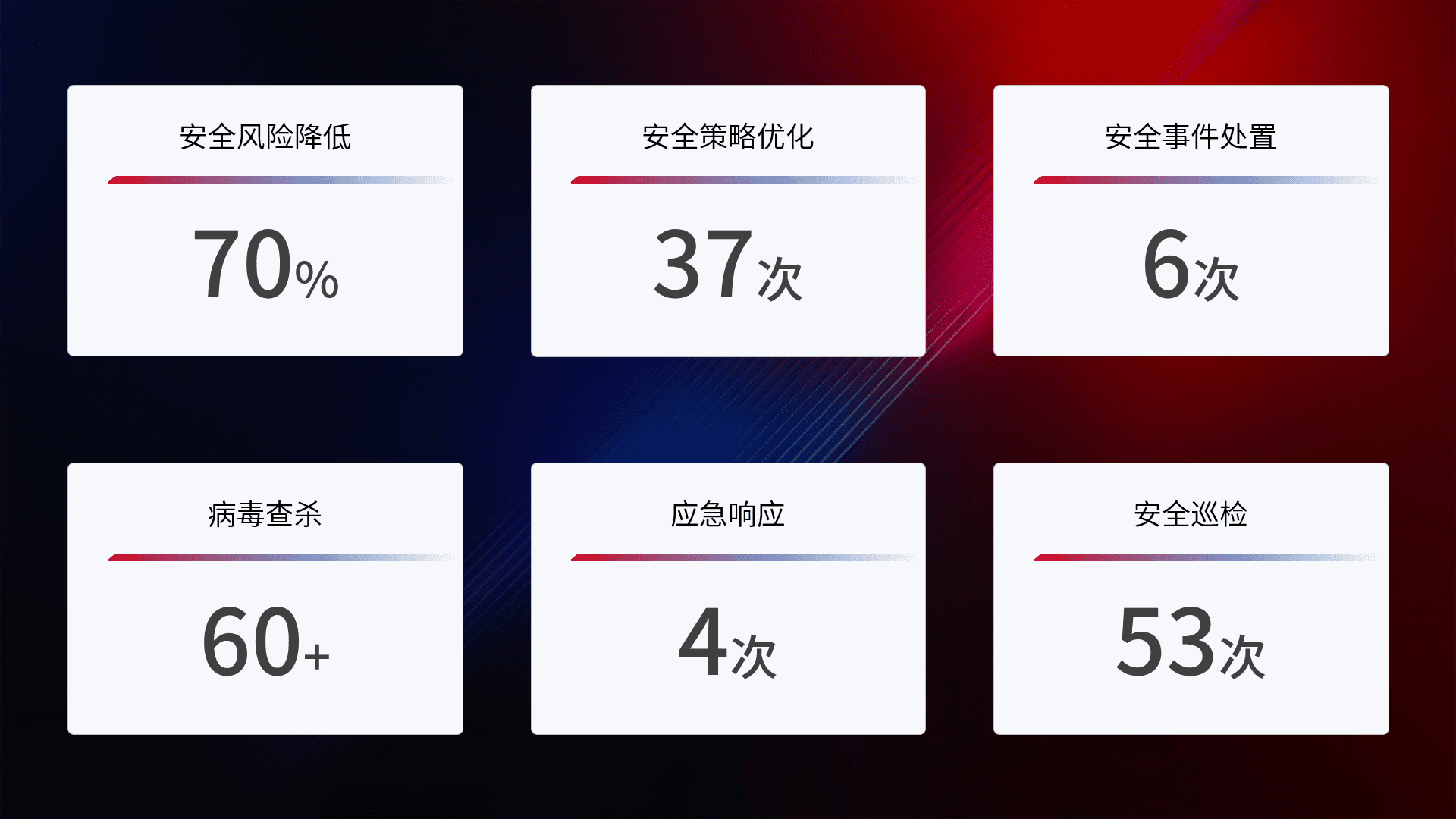 提供全面的安全事件报告体系,,,包括处置报告、、周报、、季度和年度总结,,结合持续监控,,,帮助客户深入了解网络安全状况。。。