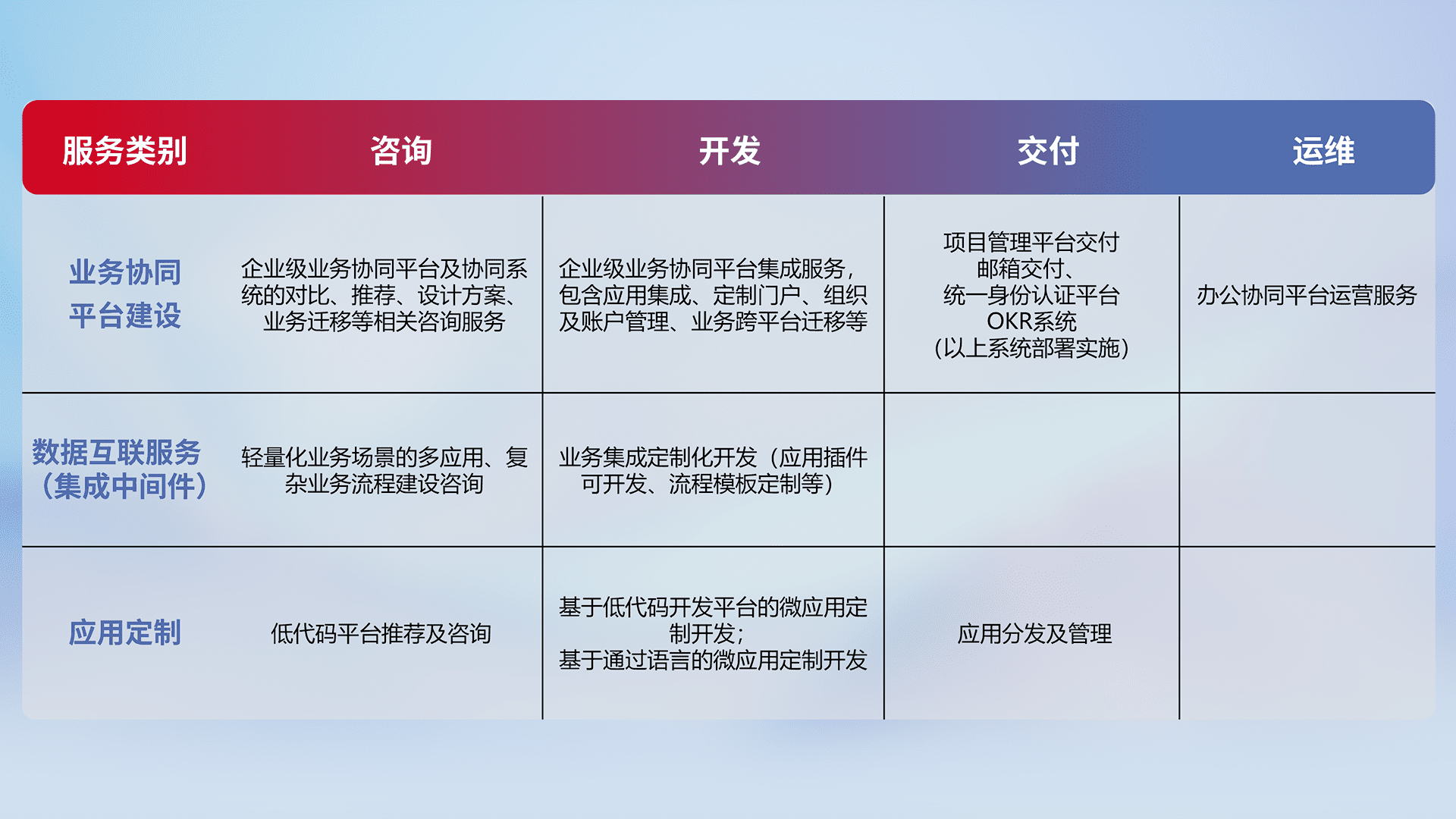 针对钉钉、、、、企微、、、IDaas等平台级产品提供产品的规划、、、、方案、、、、交付、、定制化开发等服务,,,,实现如统一协同办公、、、智能客户服务、、、、混合会议管理、、、、智能数据查询、、、等业务场景,,,,实现数字化转型。。。。
