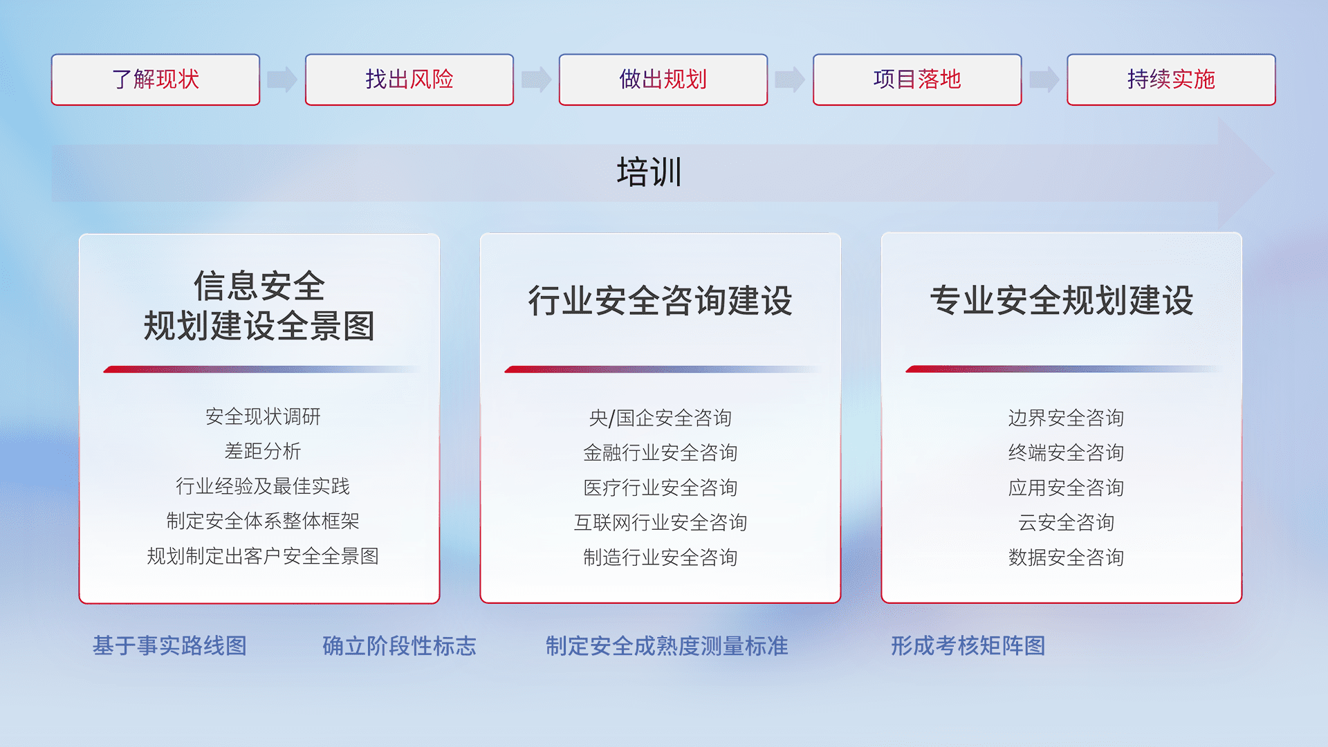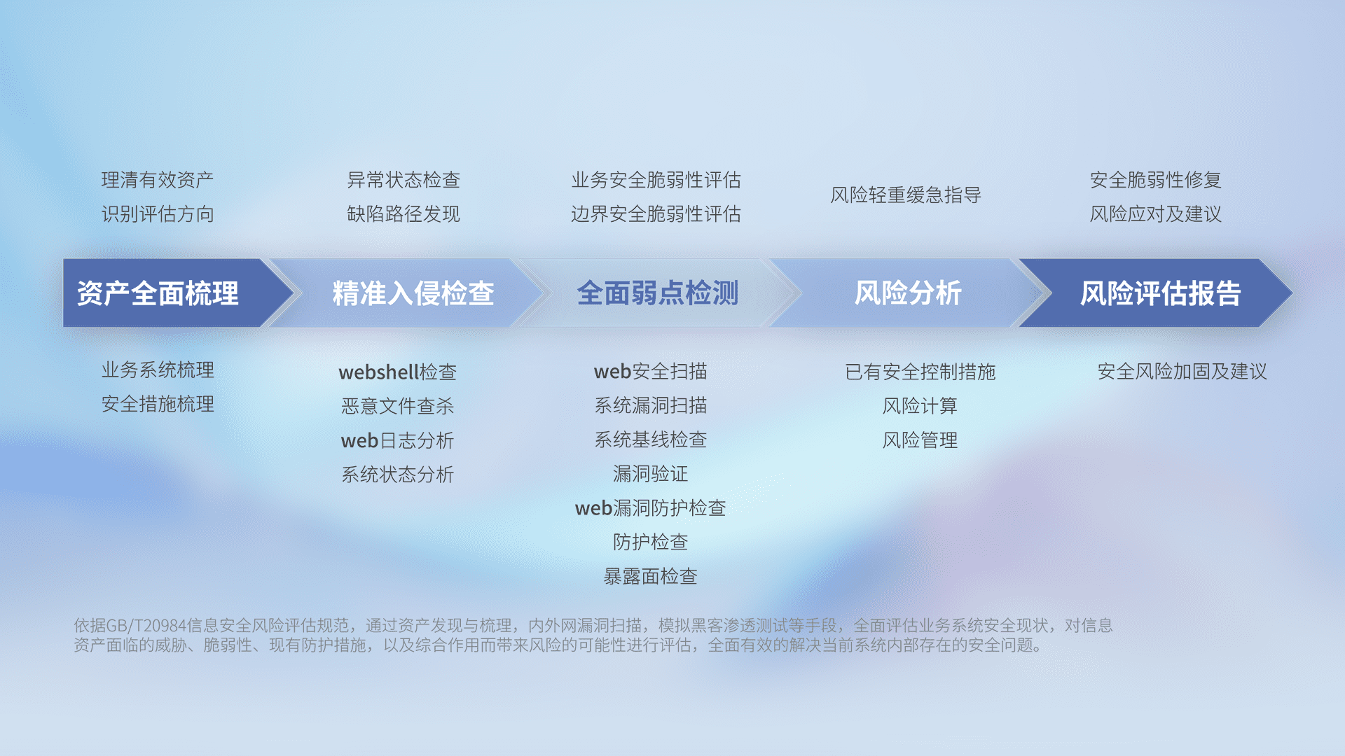 针对客户行业特性,,,,以专业的安全服务+多厂商联合解决方案提供专属的一站式安全管理服务,,,帮助客户全面感知网络空间威胁,,,,基于识别、、、、检测、、分析、、防护、、、、监测、、、响应的服务理论模型,,,从方案咨询、、、、集成交付、、评估验证、、优化加固、、、、运维运营,,,,致力于为客户提供完整的闭环管理式安全服务。。。。以实战经验为客户打造高抵御风险的安全体系,,,,帮助客户发现威胁、、、对抗威胁、、处置威胁,,,,不断积累安全对抗能力,,持续保障数字化安全。。。。